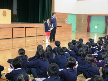 体育館で朝会がありました。まず、4月22日(日)にユニバー記念陸上競技場で行われた兵庫リレーカーニバルの走り幅跳びで、第2位になった6年児童の表彰がありました。記録は4m43cmというすばらしいものでした。次に、両サイドに座っている5年生・6年生が陵北小学校を引っ張っていっていることや、登校班の班長が班旗を使って安全に登校できているというお話がありました。