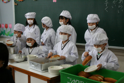 入学して次の日から給食がありました。12時になると、給食当番になった子は大きめのエプロンとぼうし、マスクをつけて自分たちで給食の準備をしました。はじめてなのに、とてもじょうずにおかずを入れたり、パンやからあげをはさんで入れたりすることができました。待ちに待った給食。とってもおいしそうに、パクパクと食べていました。残さず、完食した子が多かったです。